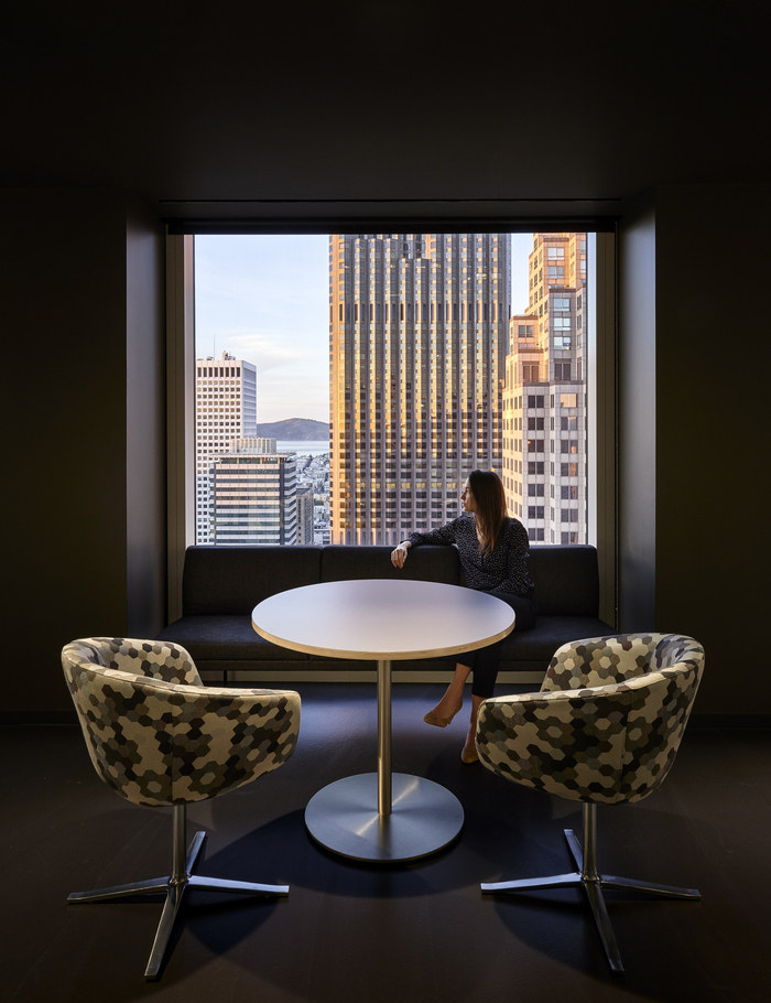 首次进入该公司办公空间时,访客会立即被一个带有线性照明的黑暗电梯大厅所包围,将焦点引导到明亮的接待区。接待台后面折叠的垂直元素成为天花板特征,穿过内部会议空间,并将接待区与优雅的连接楼梯和湾区全景连接起来。