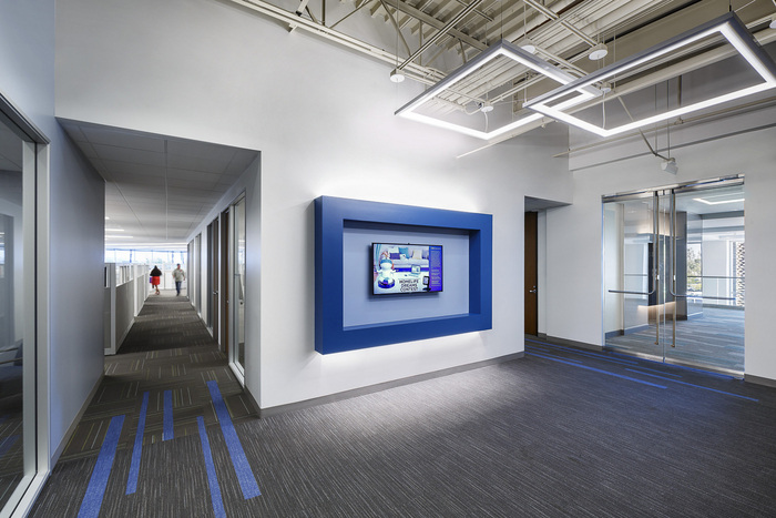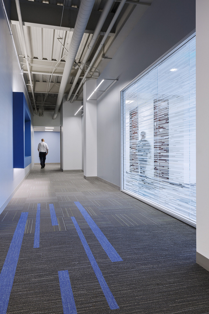 明亮的白色外露天花板和管道系统与整个空间的灰色地平面形成对比,“考克斯蓝”的流行音乐随处可见??攀叫菹⑶牟AУ舶?、座椅装饰和干墙装饰墙比比皆是。由此产生的设计是对企业品牌的清晰而有意义的诠释。
