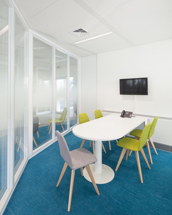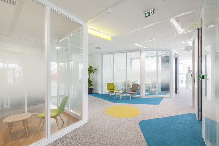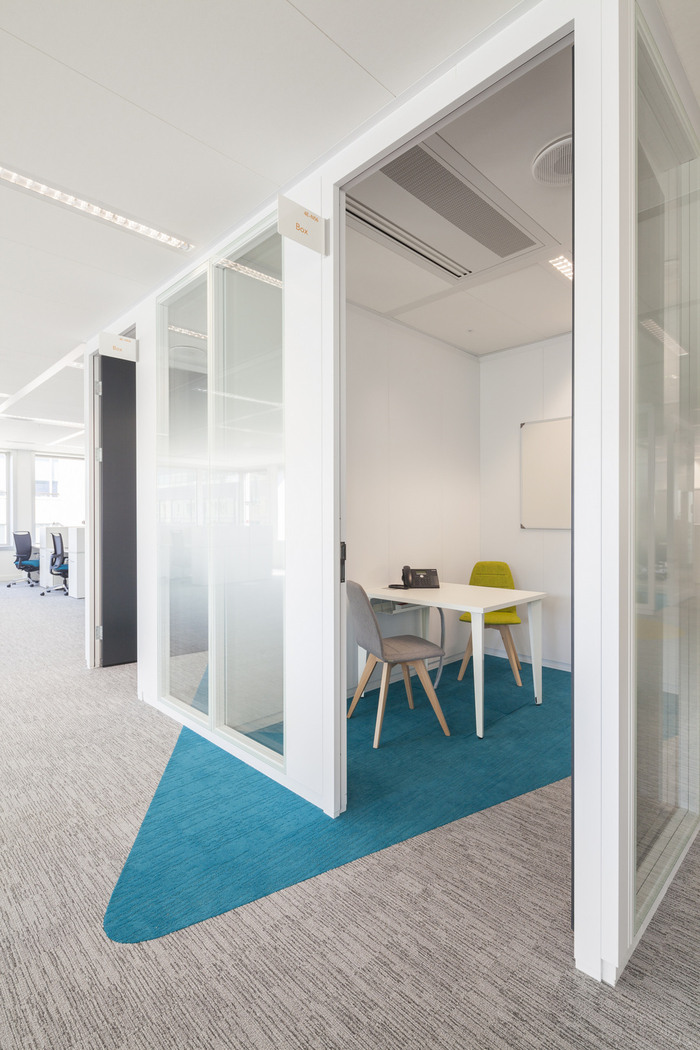 设计师使用地毯来标记会议室,并为建筑物的每个翼楼选择了不同的颜色(红色、蓝色、黄色和绿色),项目中的标牌与机翼的颜色相对应。#办公室空间设计#
