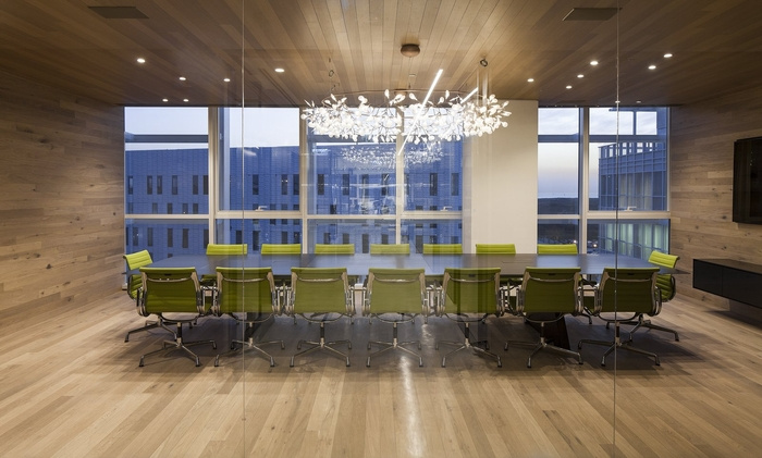 水的半透明特性在整个大堂区域营造出动态的照明效果,同时允许从主楼层欣赏屋顶露台的景色。材料连接是通过主会议室的木材迁移,通过反射池,通过楼梯的木复合墙到达露台层,然后沿着露台的反射池变成走道栏杆。#办公室内装修#