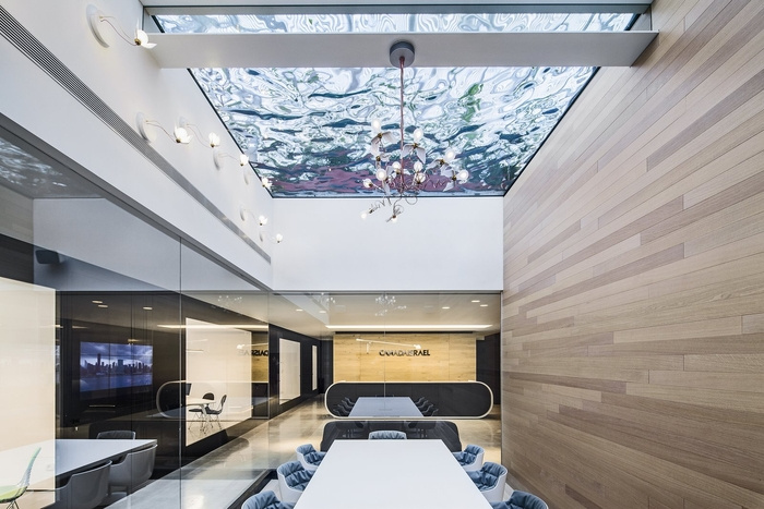 空间的流动连续性:另一个设计原则是屋顶露台空间与办公楼层之间的联系以及两个层次之间连续性的概念的体现。这个想法是通过视觉联系和材料连续性来探索的。视觉连接是通过一个玻璃底反射池作为入口大厅主会议室的天花板来实现的。