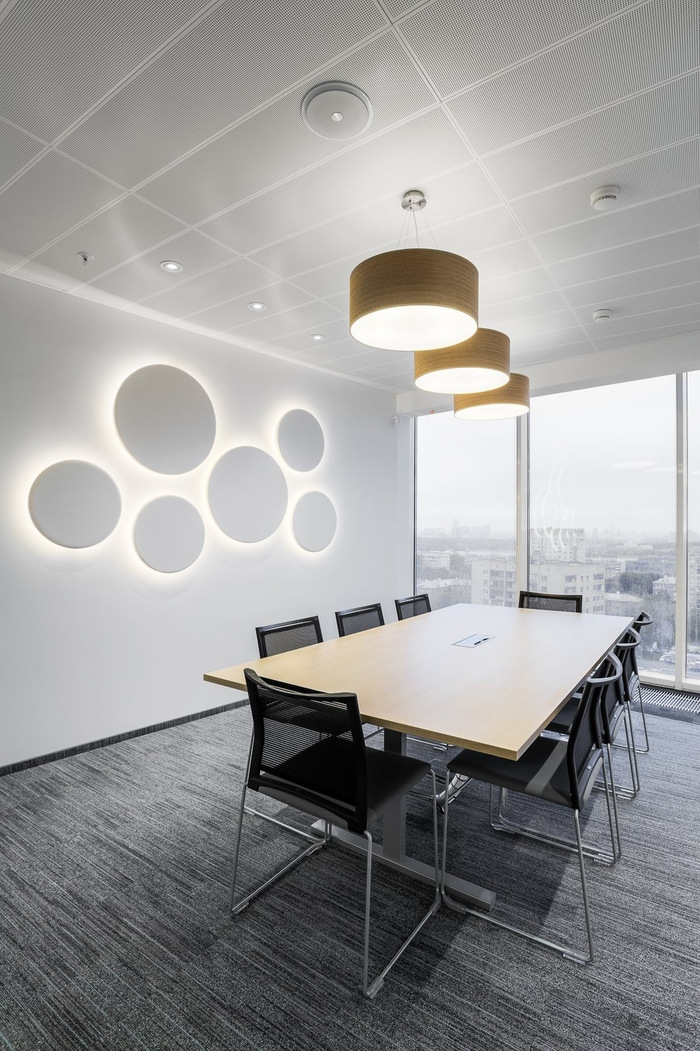 开放空间的照明是为了补充“波浪”天花板 - 与波峰平行排列的线性灯,强调它们的体积并产生眩光,使它们活跃起来。严谨、线性、饱和的办公室设计被不显眼的波浪和水的主题冲淡,伴随着白色和清晰,光影对比,反映在天花板和垫子的设计上。