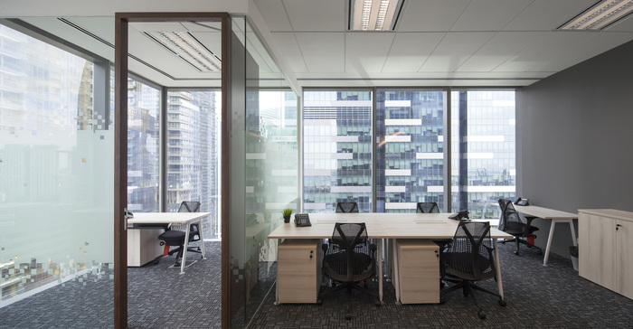 空间的活力超出了其物理楼层空间。充分利用亚洲广场大楼的玻璃幕墙,天花板高度的玻璃板被用来区分不同的区域。除了最大限度地提高自然光的渗透率,这些玻璃面板的战略性使用促进了物理隔离空间之间的视觉连通性和互动。随着人们在透明玻璃面板后面一览无余地欣赏新加坡壮观的城市天际线,这种开放性和边界的相互作用进一步增强。
