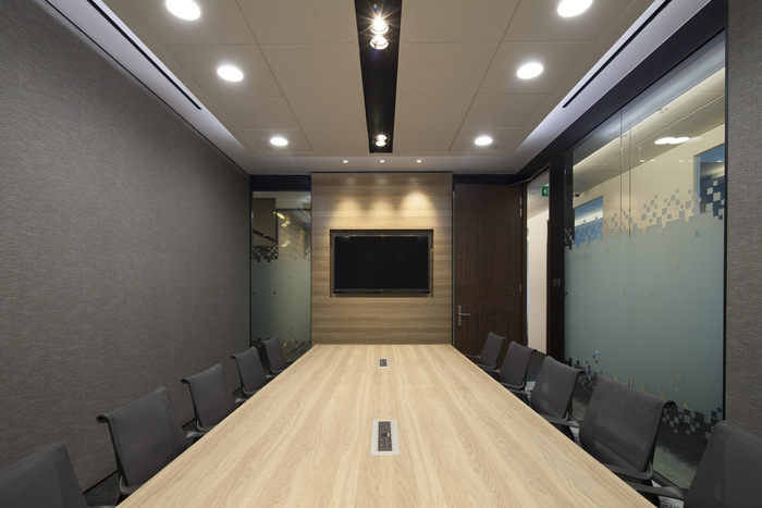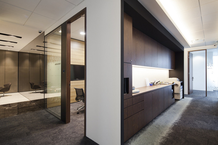 连续的书法装饰图案从墙壁流向墙壁,而地毯地板上的颜色就像墨水从一层渗透到另一层一样。通过使用这样的设计设备,办公室空间被巧妙地塑造成流畅的空间,在清晰界定边界的同时,无缝地相互流动。
