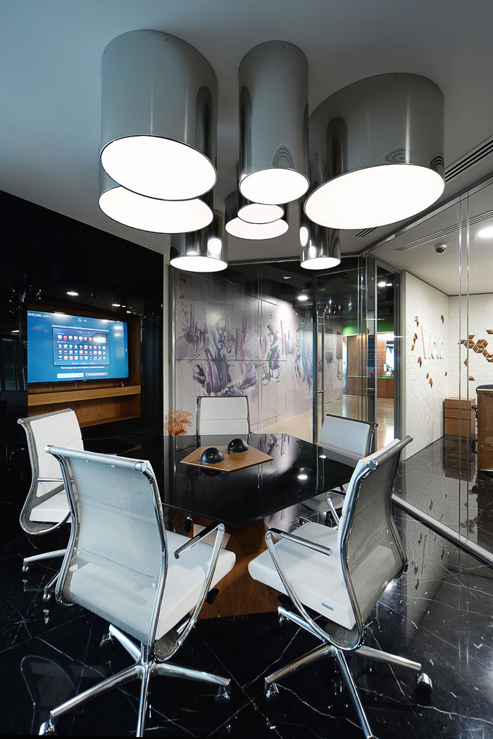正门的灵感来自地铁站,定制的地毯展示了彩色地铁地图,将游客与介绍性屏幕板连接起来,其中介绍了 企业的五个部门的引人入胜的介绍(对于游客来说,进入办公室就像开始一段创意之旅)。#办公空间设计#