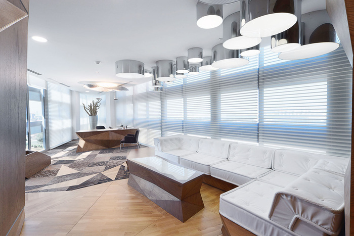 董事会会议室的特点是瑞士奶酪般的围墙和配套的定制灯具,隔断中的此类开口允许正确的开放程度,而不会影响必要的隐私。
