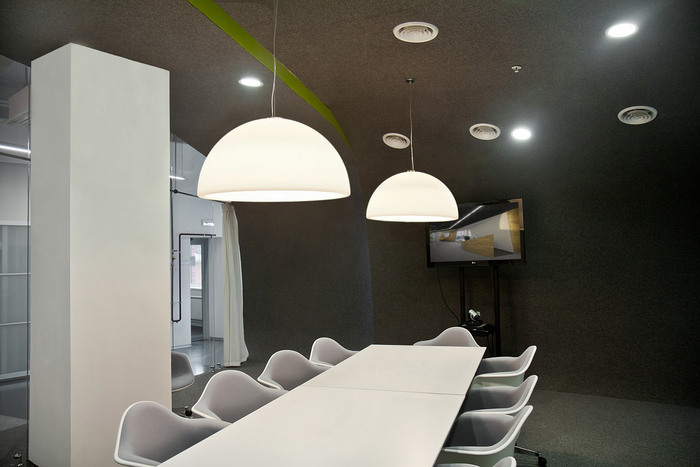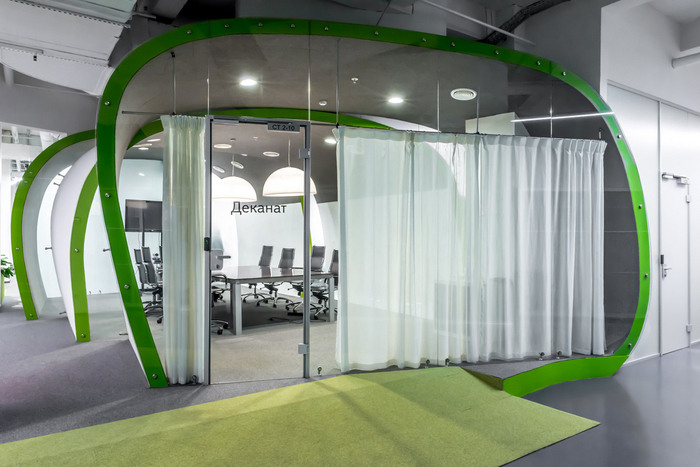 天花板上开放的通信线路,复杂几何盒子中独特的吸顶灯,还有花朵拖到天花板上的复合花盆。壁龛沙发被用作明亮的颜色点,以及非正式交流的场所。墙面装饰传统上是工业地毯、标记覆盖物、软木;当然,还有浇筑的地板。