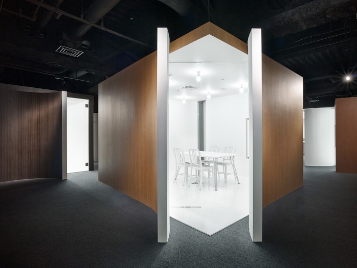 设计师在办公室周围放置了七个不同大小和装修的盒子形状的会议室,所有这些会议室都由一个已经“翻开”的墙。设计师的想法是不仅要使盒子的内部,而且要使它们周围的区域成为一个活跃的办公环境,人们可以轻松地工作和互动。