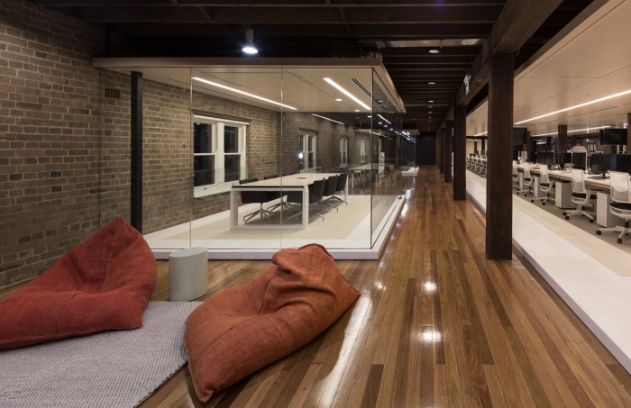 企业希望新办公室成为一个真正美妙的空间,严肃而俏皮,简单,真实和现代。结果是一个充满质感且光线充足的办公空间,俯瞰悉尼港和歌剧院,拥有四个 9 米长的定制设计工作站、透明玻璃和消失的墙壁、灵活的空间、巧妙隐藏的服务和技术、定制的细木工和超精细的细节。#写字楼办公室装修#