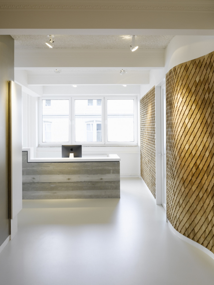 在这个项目中很难找到没有经过深思熟虑的细节。为了在进入时立即吸引游客的注意力,接待台由裸露的粗糙混凝土制成,当然,它靠在原始的白色桌面上。#办公楼设计装修#