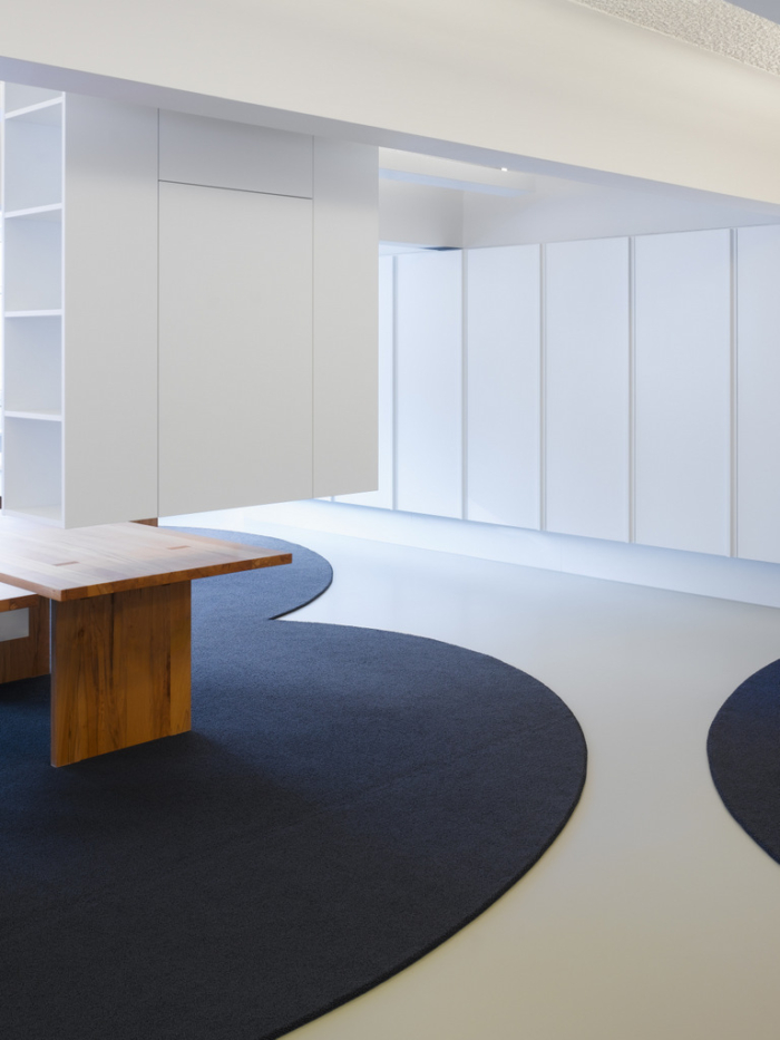 会议室有类似的前卫细节,如带有黄色重点凹槽的木镶板。另一个包含一张桌腿位置随意的会议桌,营造出一种更有趣的态度。