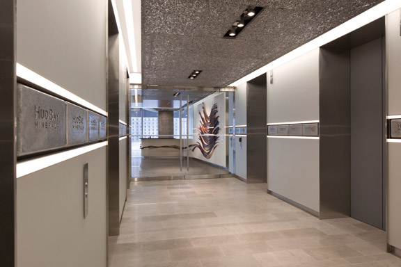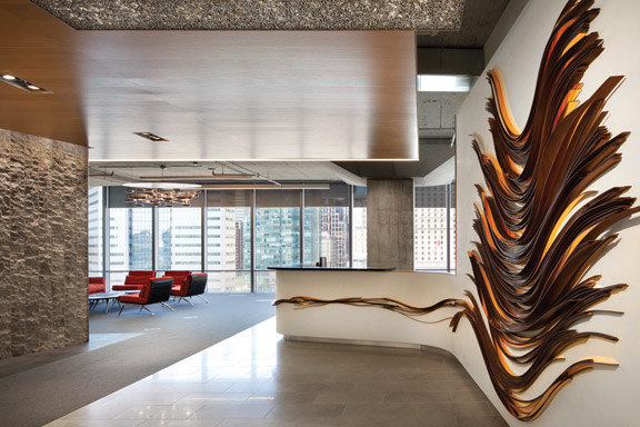 步入接待区,多伦多天际线的壮丽景色在一侧由三个独立的石墙构成,墙壁由粗糙的裂面石组成,灵感来自从岩石中凿出的垂直悬崖的照片,而铜和胡桃木的艺术作品唤起了地球的地层和蜿蜒的铜线倒入公司铸造厂的模具中。