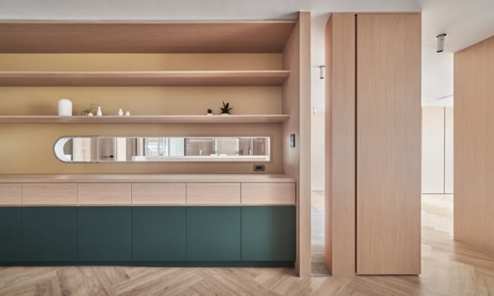 设计师用开放式设计重新定义了空间的边界,用各种几何开口穿透传统的实体屏障,让光线在空间中建立层次。散落在房间各处的光影,在“光”与“景”之间展开了一场耐人寻味的对话。