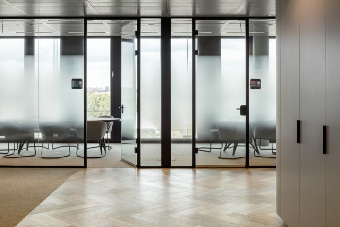 设计通过优化使用位于中央的中庭,着眼于办公室的宽敞感。电话亭、工作场所和座位几乎紧靠中庭放置,以最大限度地利用空间效果。开放区域与封闭的办公室和会议室交替出现,美丽的材料和柔和温暖的色彩的使用给办公室带来了温馨和商务的外观。
