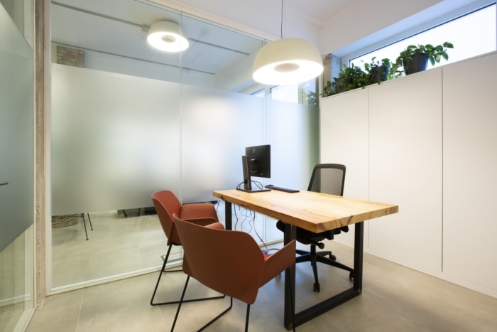为了让更多的自然光线进入,设计师扩大了立面窗户的尺寸,从一个黑暗狭窄的空间变成了一个明亮宽敞的开放工作空间。结果真的很壮观,因为设法在他们的办公室展示了急需的视觉清洁,室内设计将空间的原始材料与家具和绿色植物中的色彩混合。