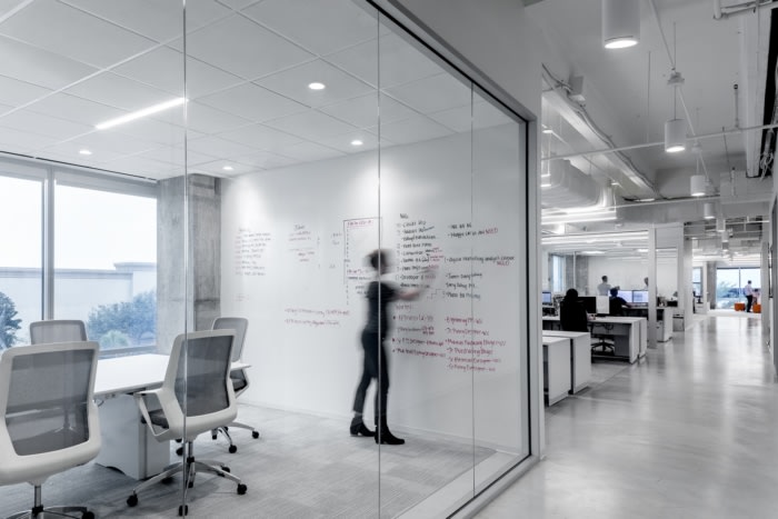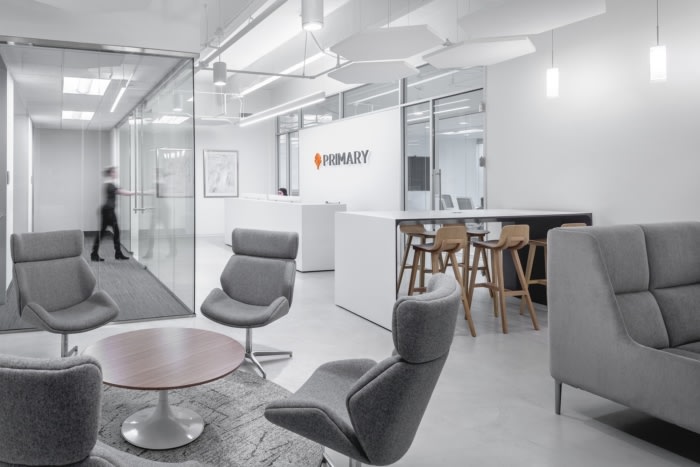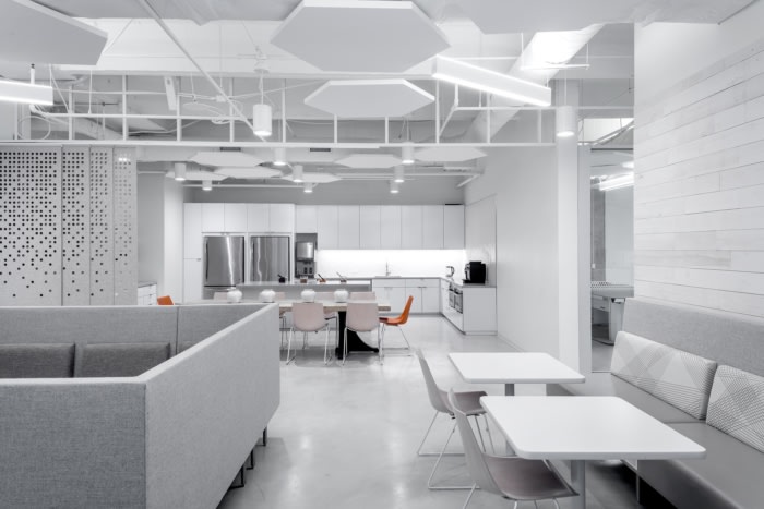 在公司标志和座位上可以找到亮橙色的微妙时刻。该布局包含用于灵活会议或工作空间的各种座位选择、带可调节高度的工作站的多数开放式平面图,以及带家庭式餐桌的休息室,可通向协作区以供全体会议。