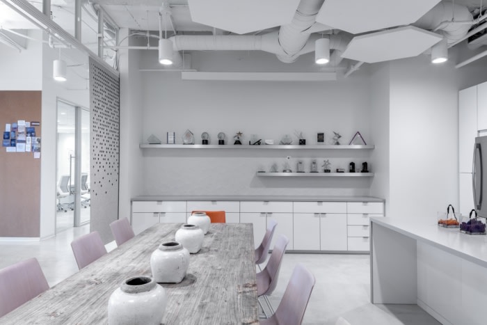 从白色混凝土地板和白色墙壁到白色橱柜和白色外露天花板,清新、纯正的白色在整个办公室设计中扮演着主角。柔和、凉爽的灰色辅助色赋予平衡和轻微的对比。中性的建筑元素充当了公司品牌色彩流行的空白画布。