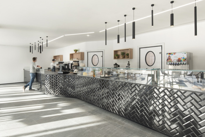 支撑区域的特点是外墙的多边形模仿岩石斜坡,唤起冒险的环境,引导游客进入一个非正式的、异质的、活跃和灵活的空间。工作环境旨在满足最多样化的功能和需求,从专用于高度集中工作和电话呼叫的区域到更具协作性和开放性的空间环境;配备屏幕和数字预订系统的会议室具有不同的容量,可舒适地容纳两人或三人的会议,以及更大的会议;而酒吧则变成了一个进行流畅和非正式互动的场所。