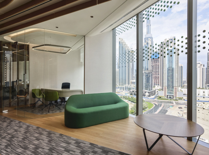 办公室设计装修:木鳍制成的天花板对角地穿过整个办公室空间