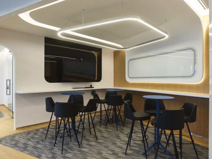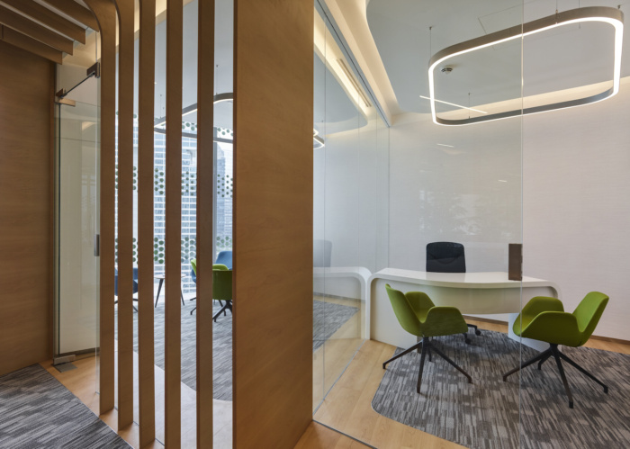 由弯曲的木鳍制成的天花板对角地穿过整个办公室空间,向下弯曲成为一个垂直的屏幕或包裹和隐藏建筑物的结构柱,使它们成为组合的一部分,而不是断开的元素。天花板设计将整个概念结合在一起,将多种程序组织成独特的姿态,引导用户体验。