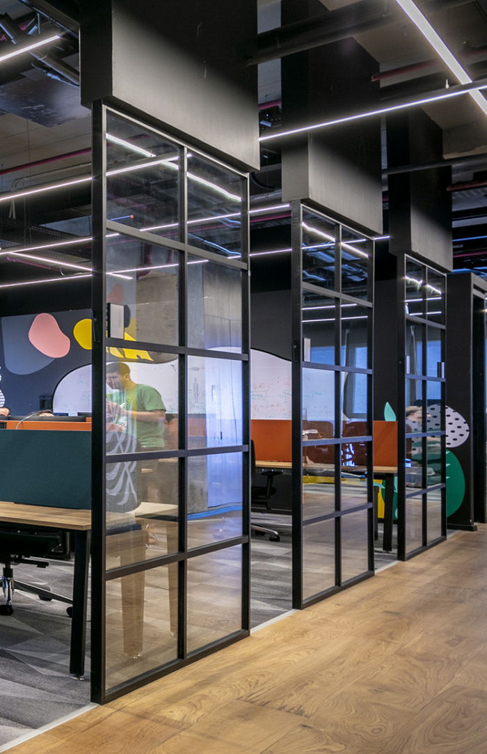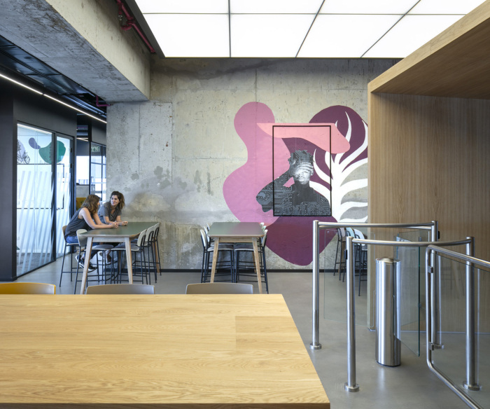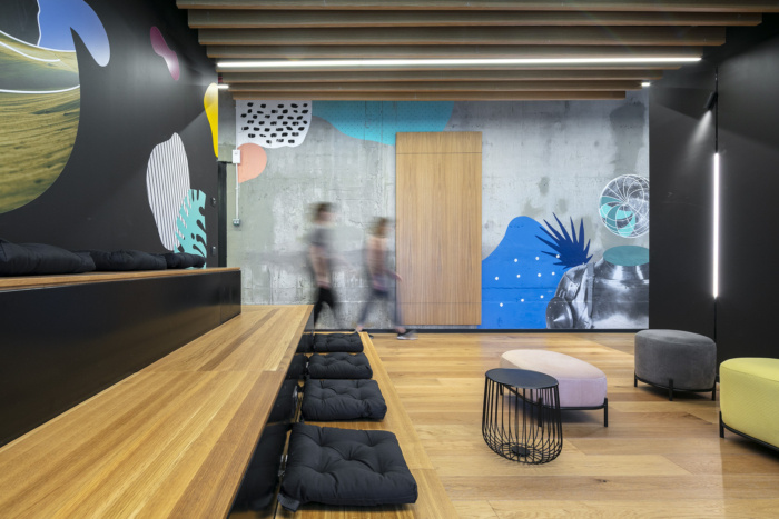 木材、混凝土、玻璃和黑色金属等永恒的材料包裹着建筑的核心,为将充满活力的图形元素层叠在顶部创造了完美的基础。在这里,核心墙是一个自由表达的地方——拥抱源自网络世界的图形艺术。#办公室装修效果图#