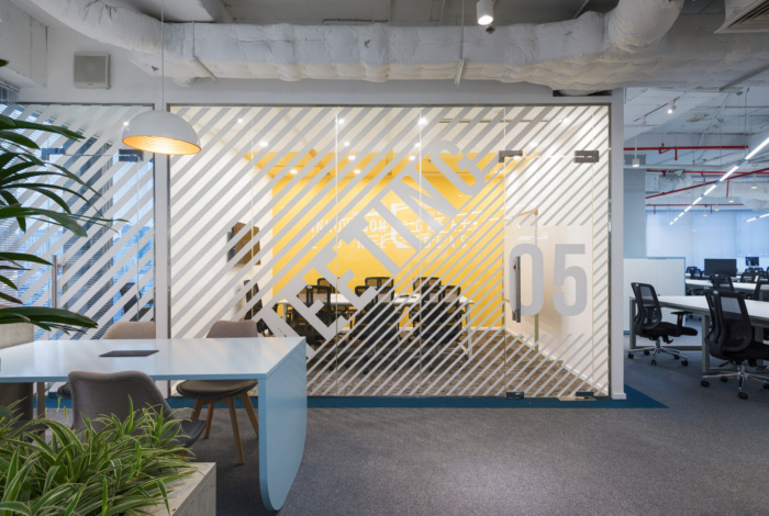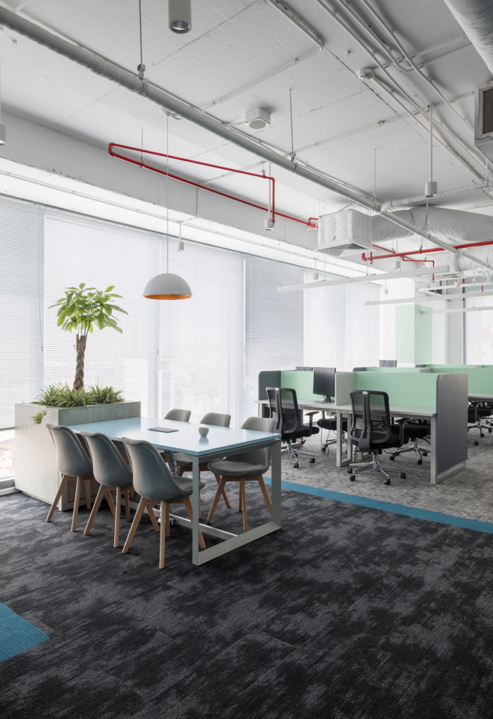设计师基于上述标准接近和构建概念的项目,在对客户进行分析和研究后,将企业办公室的这一概念命名为“蓝芯”。该项目的主色调是从品牌标识的颜色范围中挖掘出来的,选择蓝色来保留蓝芯的概念,这是一种唤起整个项目技术的颜色。