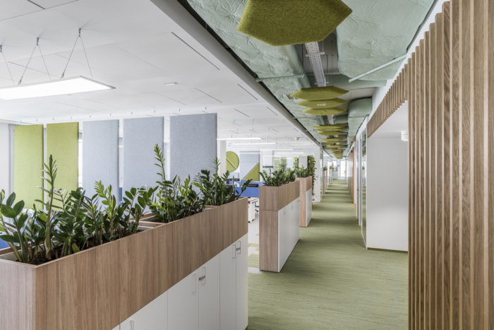 该项目的主题是受自然和用户友好材料启发的元素,确保舒适和积极的空间接收。受城市公园和生态启发的代表性接待区欢迎客人和员工。