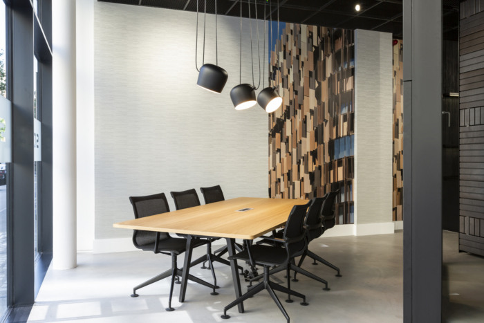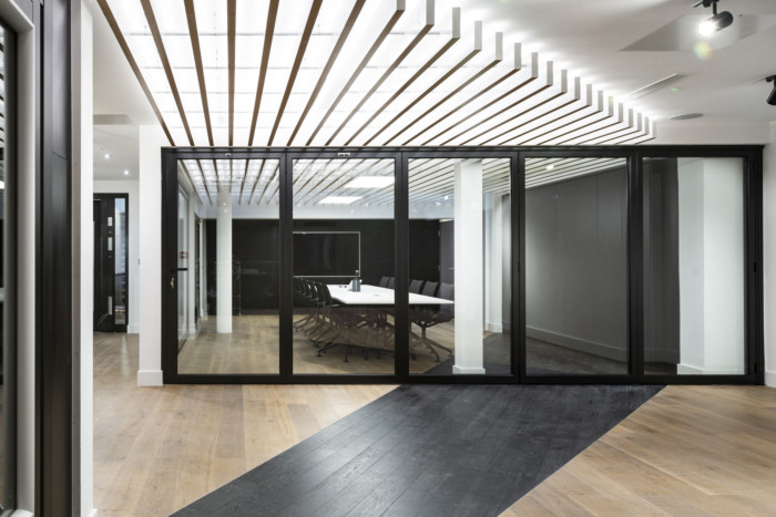 主要功能包括带有内置 LED 照明的悬挂式木天花板板条、陈列室的轨道照明、折叠墙(客户自己的产品)、茶点区的定制烧木包层墙、拉伸金属天花板、定制展示架、定制壁纸以客户自己的作品组合为特色,以及带有发光标志的新外立面。