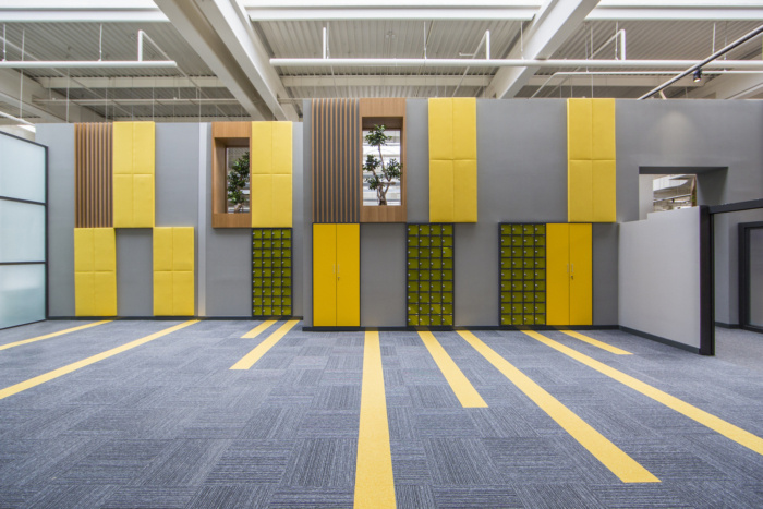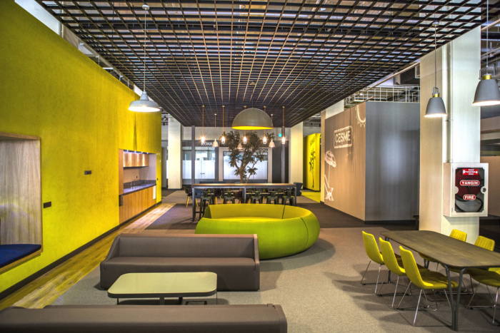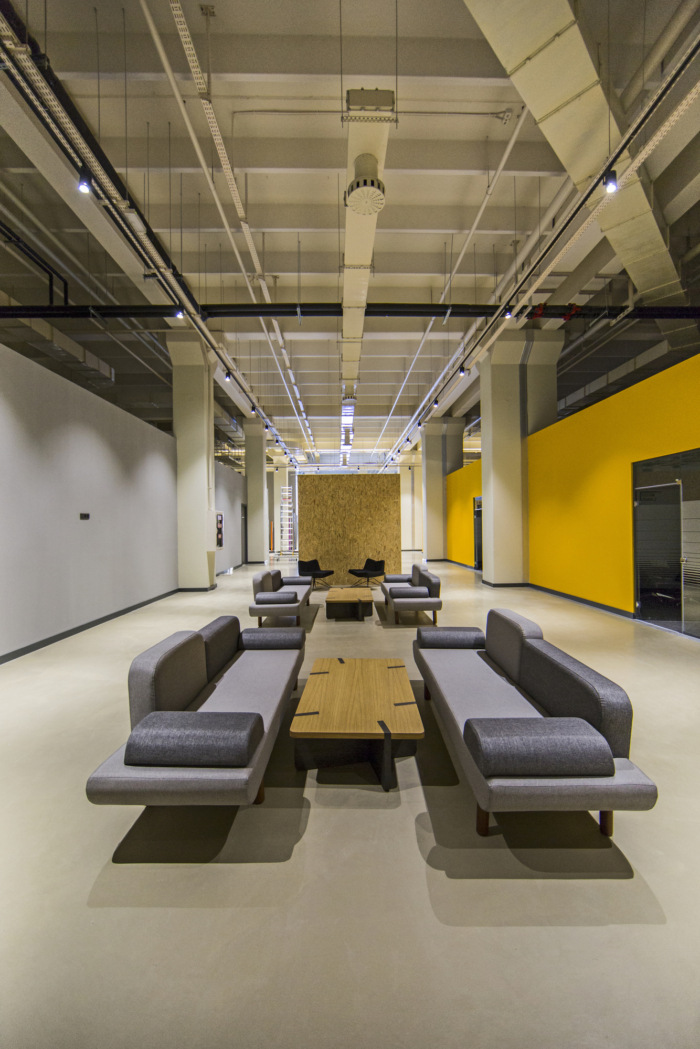 独立于墙壁和天花板的会议室、休息室和研讨厅被设计成不同材料和颜色的浮动盒子,旨在打破现有结构的统一性。这些单元被认为对所有写字楼办公室都可以轻松到达的共享空间开放,同时提供具有不同天花板水平的人性化尺度,以及在空间内创造空间的想法。#写字楼装修#