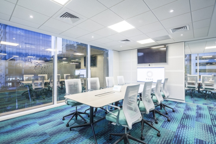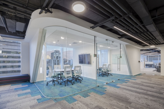 作为7层空间的总体结构,从电梯出来的“广场”是每一层的主要元素。在这里,我们有可以看到安第斯山脉的弧形自助餐厅、会议室和用于非正式会议的不同座位,这是我们每天喝一杯咖啡、协作、到达、见面和离开的空间。上方带有103个LED点的圆形金属天花板,从那里灯光将我们引导到工作空间的不同区域。#办公室写字楼装修公司#