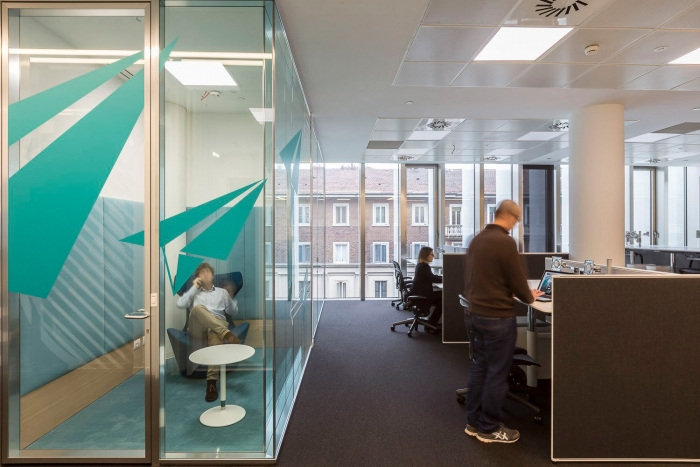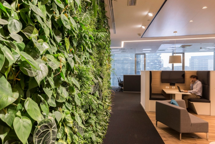 毗邻接待区和欢迎区的是会议室,其中两间由可操作的墙隔开,以提供更大的空间使用灵活性。作为工作空间的支持,靠近中央核心的是一个休息区,里面有一个迷人的垂直花园、几个电话亭、配备视频屏幕的非正式会议室和均匀分布在空间中的复印区。#写字楼装修设计#