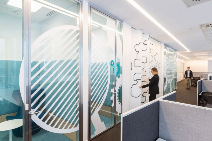 办公空间内的深色地板搭配活泼的色彩和俏皮的图形