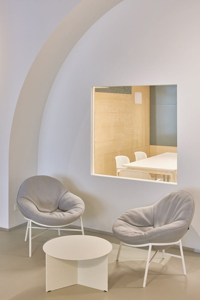 新办公空间的结构是通过引入许多拱形体量和各种隔断来构思的