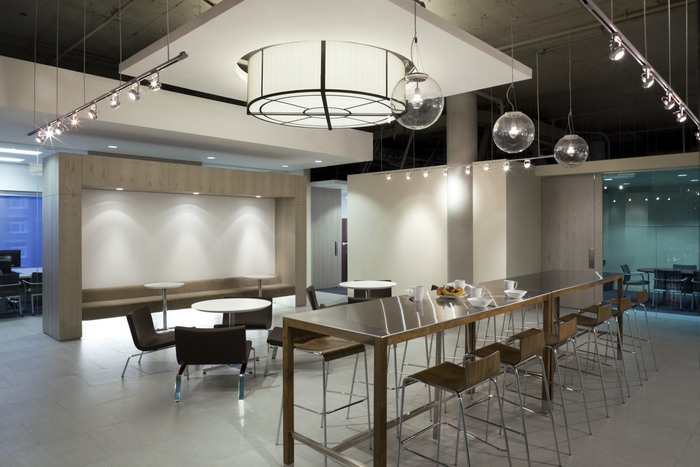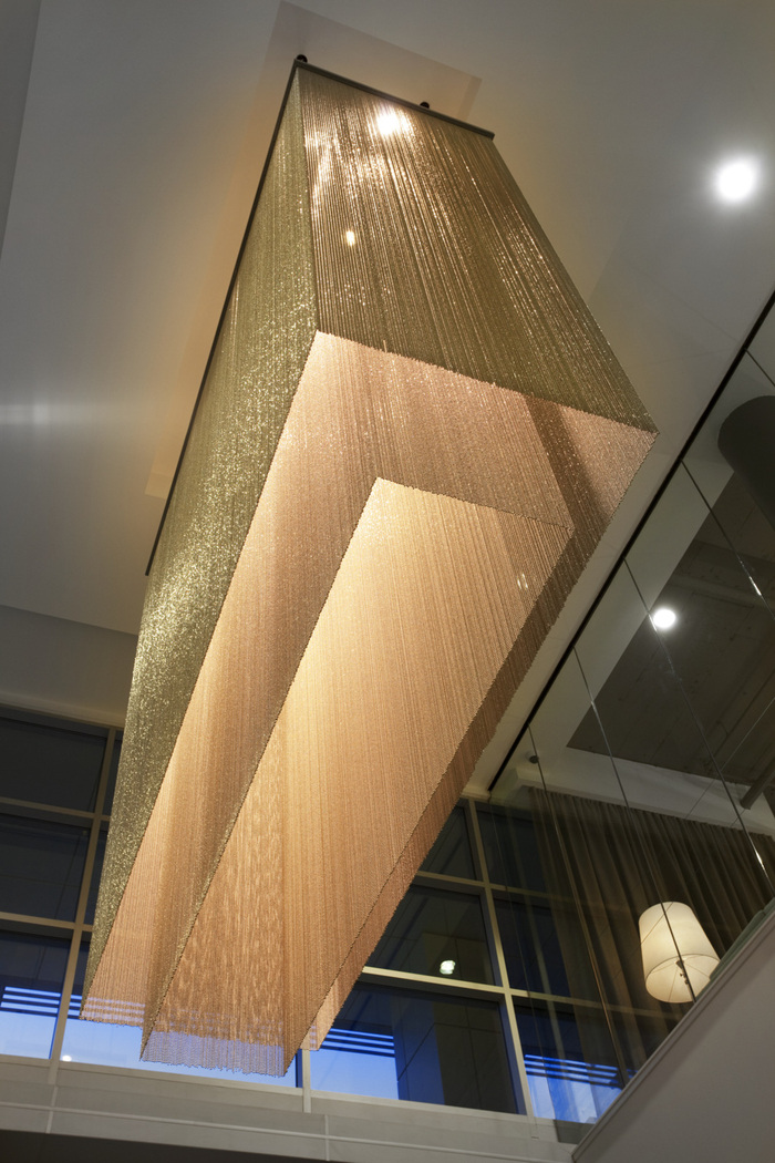 干净的现代细节和建筑形式承认了建筑的现代主义设计,但被软化以营造温馨友好的氛围,并通过自然灵感的调色板和自然纹理和图案突出公司对自然环境的尊重??攀教旎ò搴痛笮投ㄖ频踝雇怀隽丝占涞墓婺:吞寤?,同时通过家具提供了具有现代经典参考的住宅特征。#办公室空间设计公司#