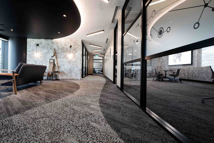 通过霓虹灯、铜管和城市元素等定制组件的对比,河流与城市景观的关系以及鹅卵石般的地毯纹理和颜色反映了布里斯班的河床、水和当地植物群。#公司办公室设计#