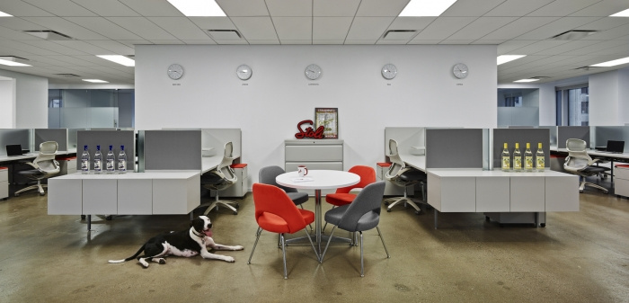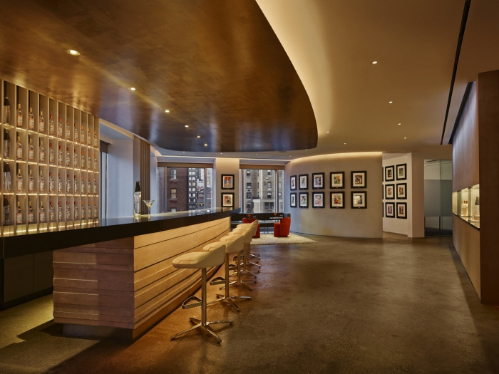 红色玻璃办公桌和超大酒吧点缀着面向公众的活动空间。酒吧里的石灰石向瓶子上的莫斯科酒店致敬。酒吧本身向痴迷于混合学的美国文化致敬,伏特加从来都不是孤立的。除了这个多功能区之外,经典的红色和雅致的家具遍布整个明亮、开放的办公空间。#时尚办公空间设计#