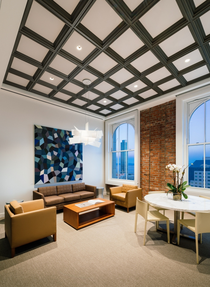 崎岖的周边砖墙、原始的内部混凝土柱和剪力墙、机械管道和电线都暴露在外。接待台后面的一个高大的洒水器立管也故意暴露在外,并在显眼的地方涂上了红色的消防车,以突出并宣布:“我们与众不同。”#专业办公室装修#