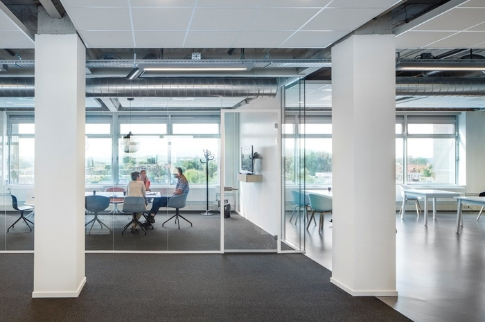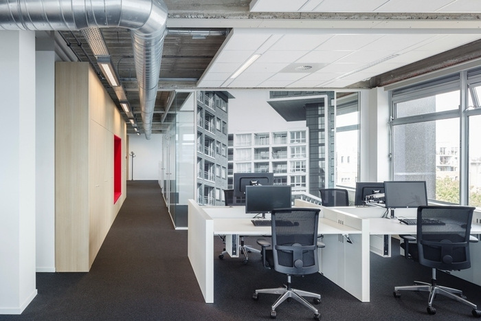 封闭式走廊和独立办公室的传统布局转变为带有隔音天花板的开放式概念。新的室内概念展示了裸露的混凝土结构,优化了刚性战后办公楼的空间品质。#办公楼设计装修#