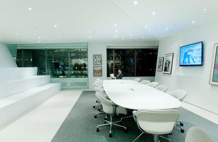 企业的身份象征性地融入了设计中的北极意象:破碎和极简的北极景观激发了办公室的物理表达,产生了白色的切片和折叠平面,让人联想到破冰。#办公空间设计装修效果图#