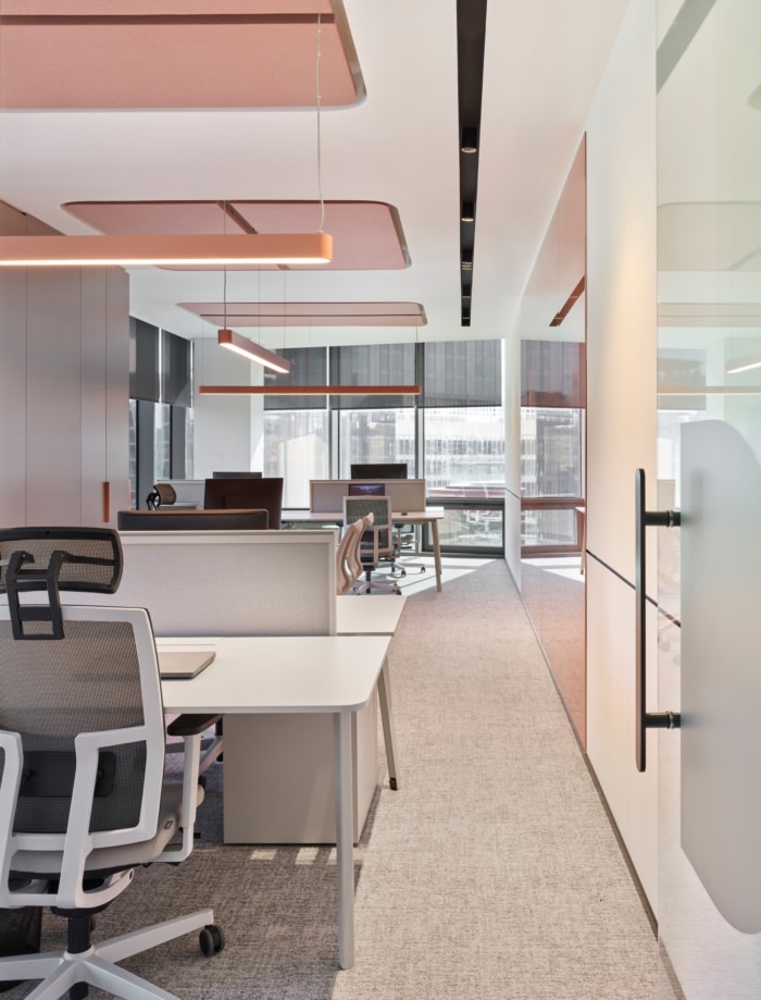 在整个办公室的楼层:流通区、自助餐厅和会议室使用了豪华的乙烯基瓷砖(LVT)材料,而工作区则使用了地毯。覆盖织物的玻璃棉与地毯一起应用于天花板,以帮助办公区域的声学。在许多部门房间里,根据部门的需要,按照特殊生产的线性照明,应用了鲑鱼色的彩绘玻璃。这样,在赋予房间更活泼、更时尚的外观的同时,还创造了玻璃等适合做笔记的表面。根据客户的声学需求,双或单玻璃隔板系统用于房间隔板。#办公室的设计风格#