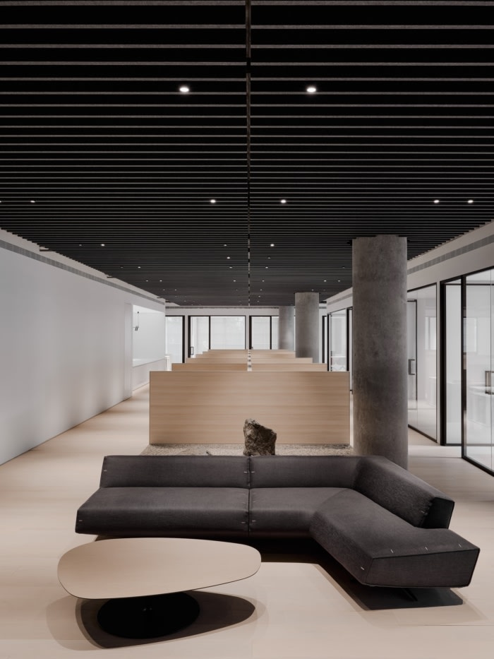 岩石和砾石花园巧妙地定义了个性化的空间,并在公共和私人工作区之间创造了流通。通过在天花板上使用紧密间隔的吸音毡百叶窗系统,声学反射混凝土内表面被隐藏在一个类似画廊的环境中,这朵云还隐藏了灯光、扬声器和机械系统的元素。#办公室装修方案#