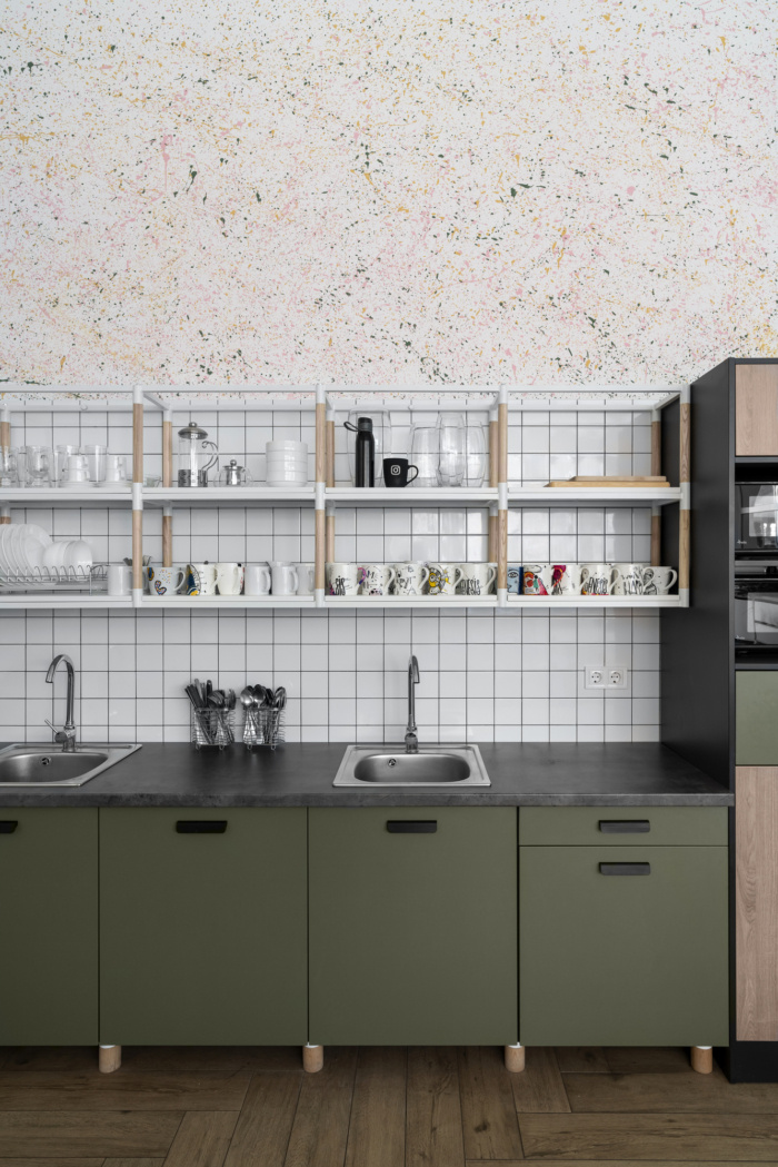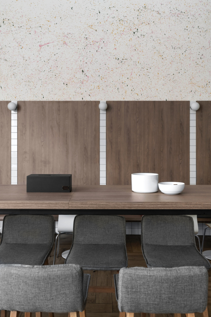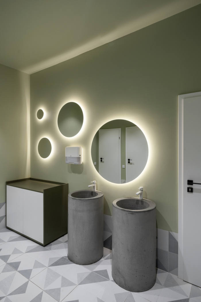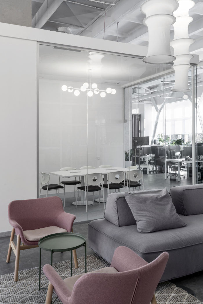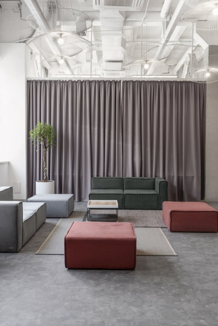 以柔和的圆形形式和家具支撑的几何直线,实现整体书写风格的视觉轻盈??趴占湟悦髁恋纳首笆危怀龊投员刃菹星?。该项目选择了一种轻盈宜人的质地,结合房间的工业风格建筑。纺织品柔和的颜色、透明玻璃、混凝土和木饰面。柔软的形式和复杂的纹理相结合,为开放空间的办公室创造了一种舒适感。#办公室装修案例#