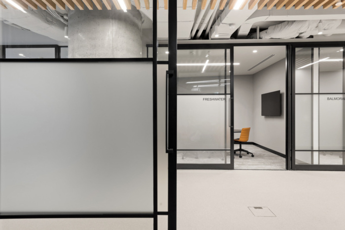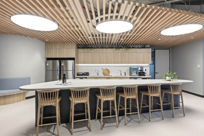 大地板靠向中央客户和员工休息室、员工论坛和厨房,从接待处和会议室通向。从接待处和董事会会议室到中央枢纽的流动促进了透明度和包容性的概念,为员工和客户的大型市政厅会议和社交聚会提供了机会。#办公室装修设计公司#