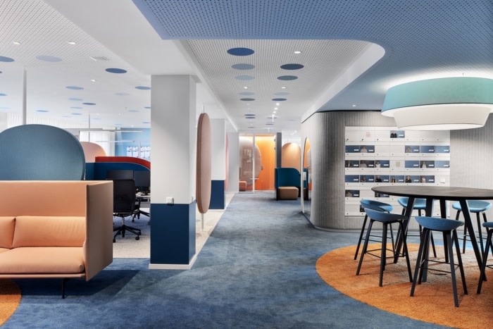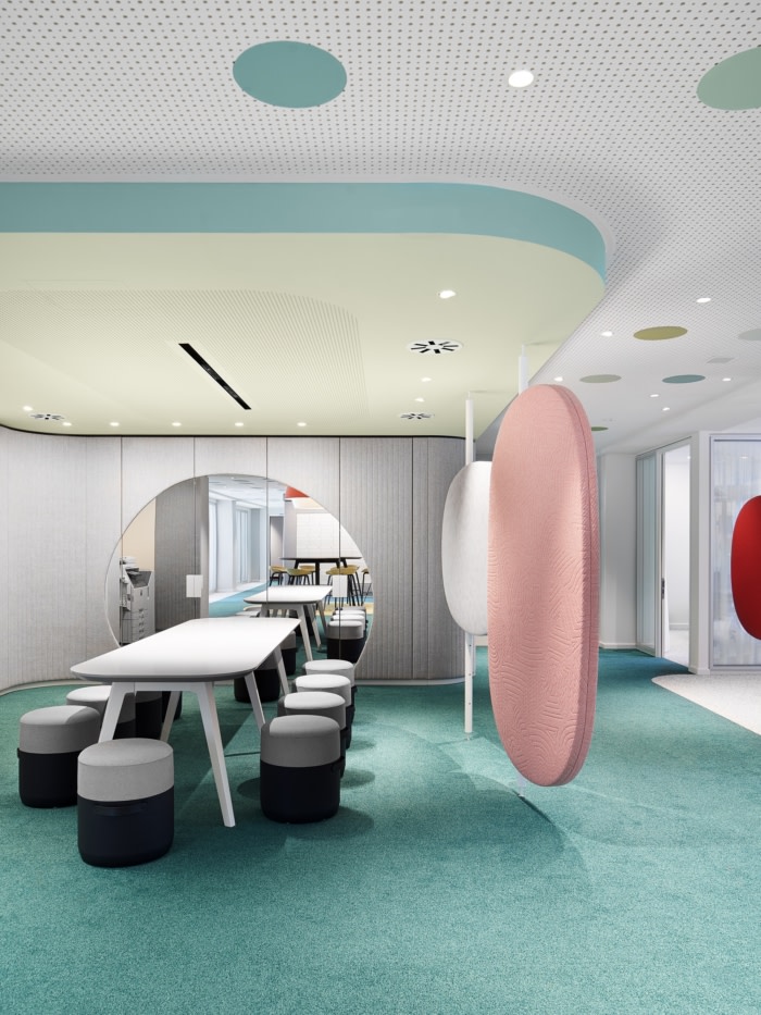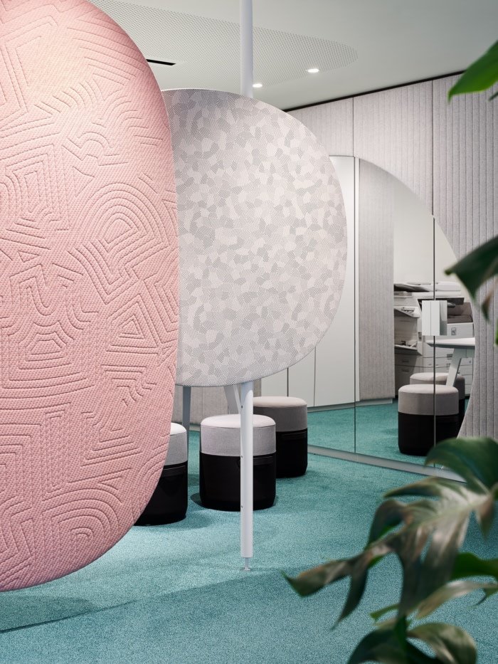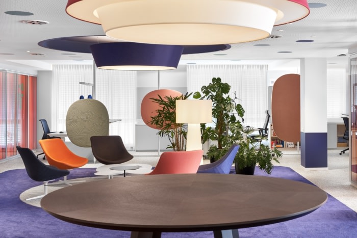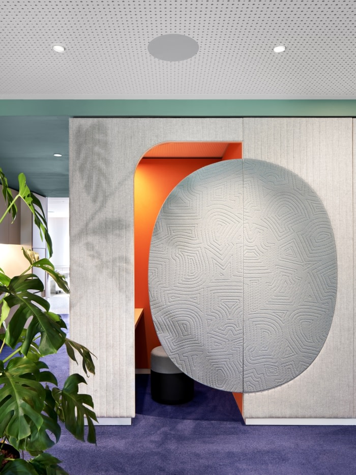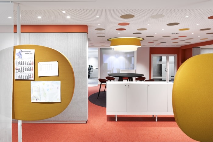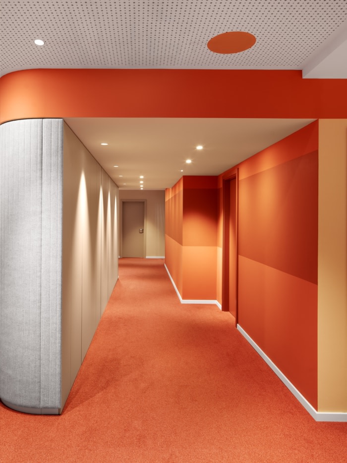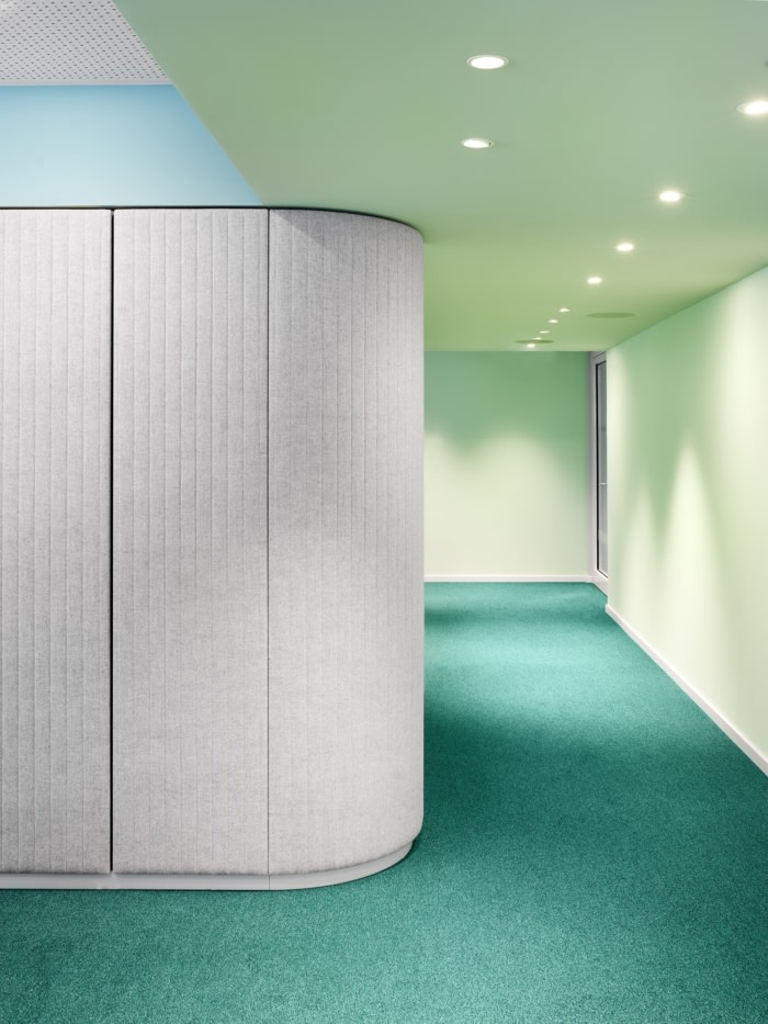 独立式餐具柜提供可锁定的存储空间并包含作为引导对象的特定区域,从而创造隐私。媒体技术直接集成到软垫墙中。照明概念突出了房间面板和软垫墙作为构成开放式办公室并赋予其明确特征的同质元素。#办公楼办公室装修公司#