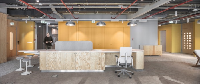尽管提到了工业过去和科技未来,但通过使用流线型、友好的形状、天然材料和柔和的色彩,这个地方温暖宜人:天然贴面(松木、白蜡木、橡木)、用于吸音元素的天然羊毛毡,木纤维天花板处理,软木隔音墙。#办公室装修案例#