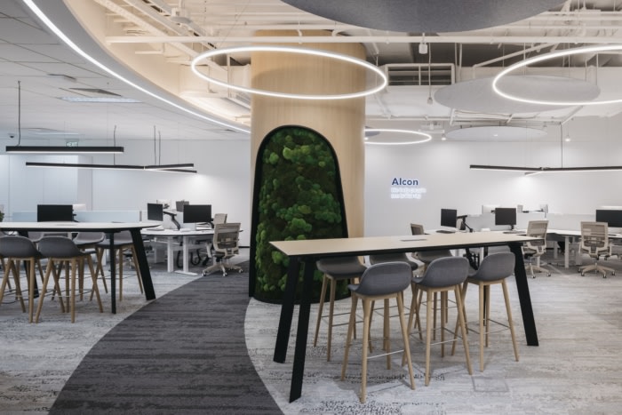 曲线图案改变了整个空间的体验。从模仿人眼形状和正在使用的医疗器械。圆形灯和品牌墙的有机形状,可以从主入口捕捉人的视线。#公司办公室装修#