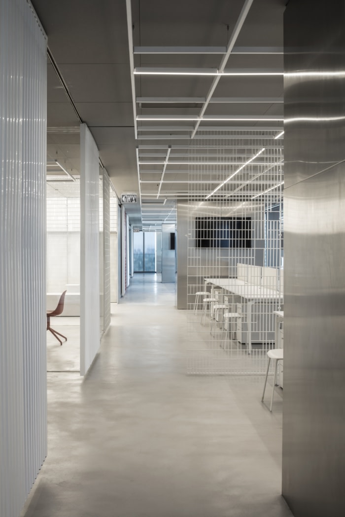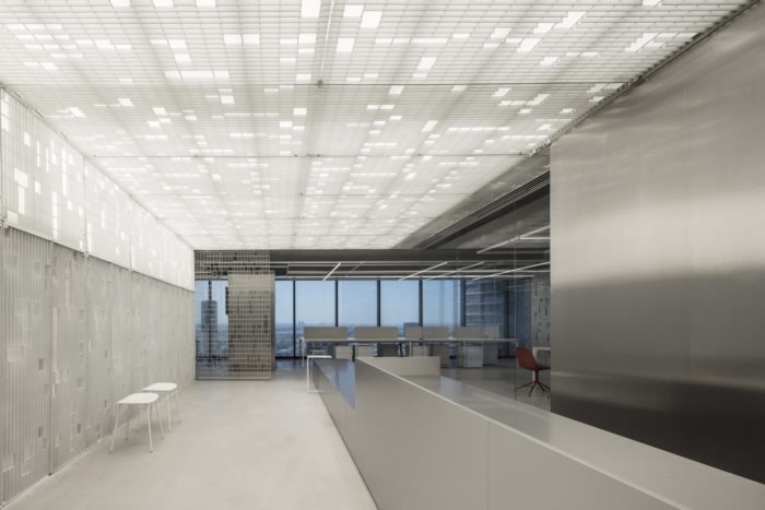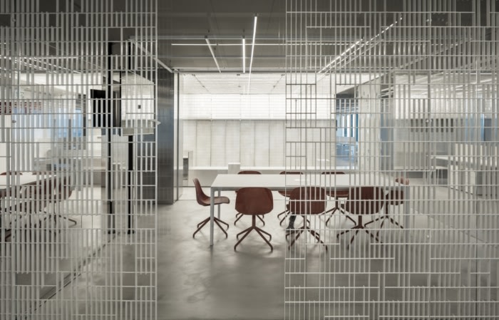 钢格板被解开以创造一种新的模式,并从简单的网格转变为工业花边。这种编织状的隔断在不阻挡空间的情况下产生了分隔。这种所谓的编织的开放性使得周围城市景观的微妙、分层视图成为可能。白色波纹聚碳酸酯板被设计成更加自信的分区,提供更多的隐私。#办公室设计效果#