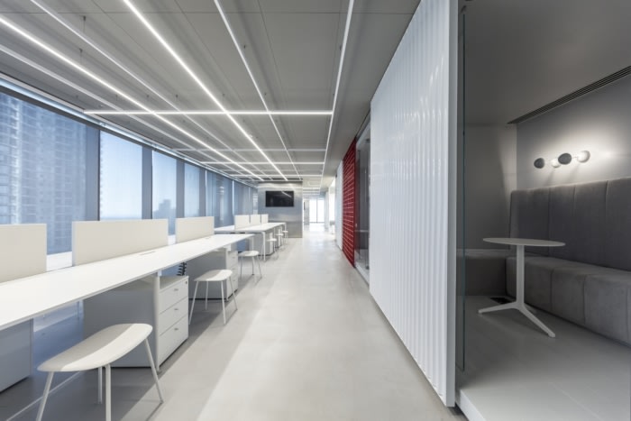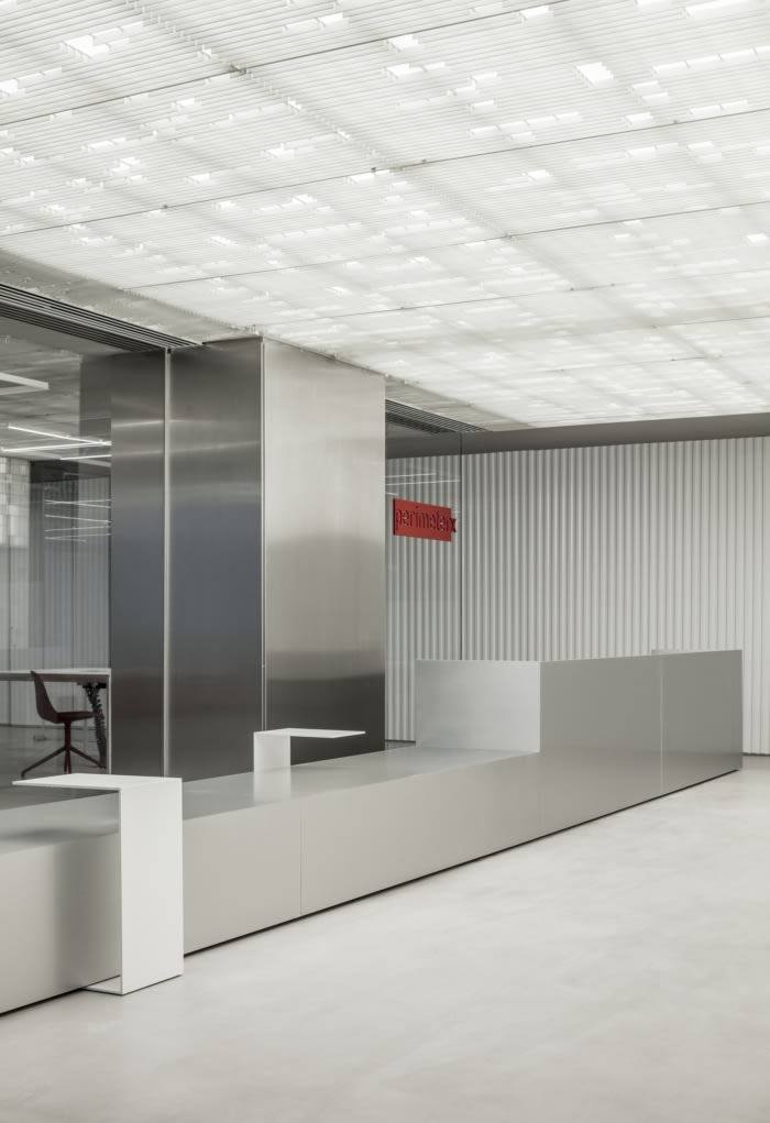 空间的配色方案是全白色和灰色,带有来自公司品牌的红色调。材料调色板融合了时尚和工业——柱子和墙壁的铝覆层,与混凝土地板和白色油漆饰面和白色波纹聚碳酸酯板的拆开焊接格栅的隔板并列。#办公室设计案例#