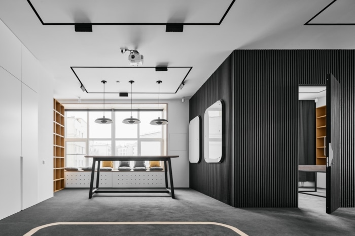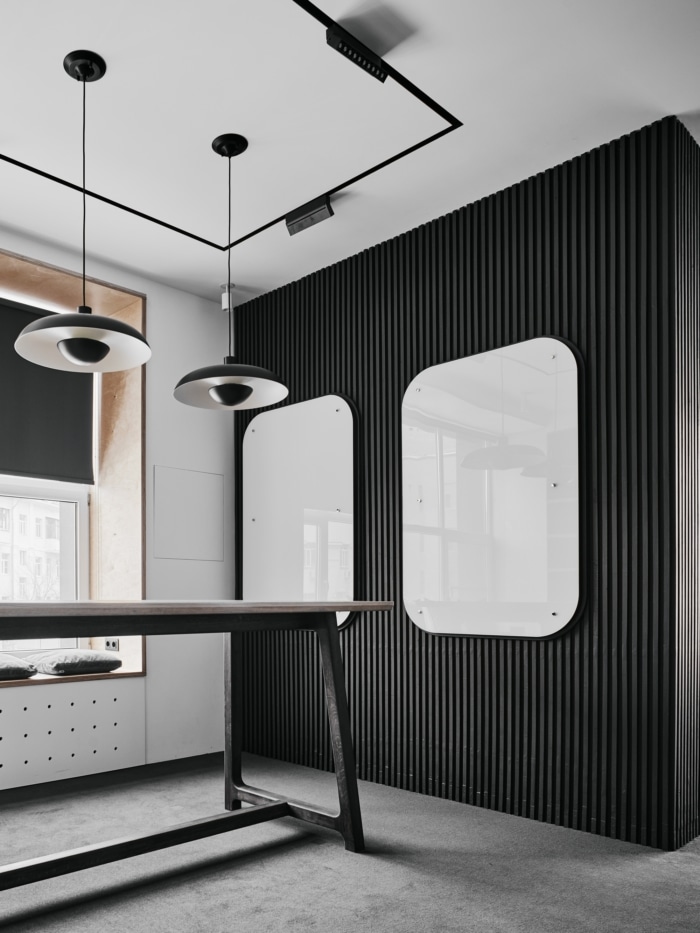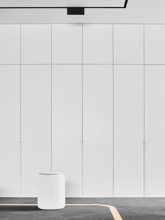 团队自己设计了墙上的艺术品,因为不想用额外的色点使墙壁超载,所以创建了单色的白色面板,其上的绘图仅由于体积和明暗而出现。#办公大楼装修公司#