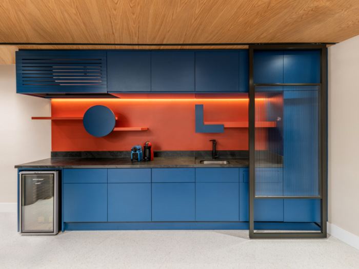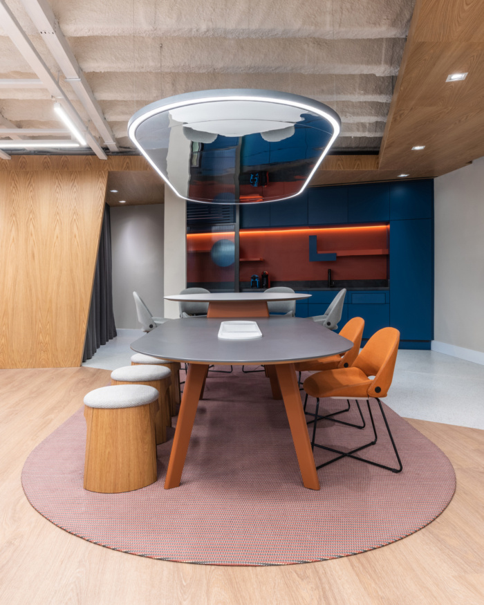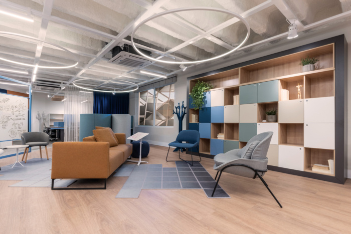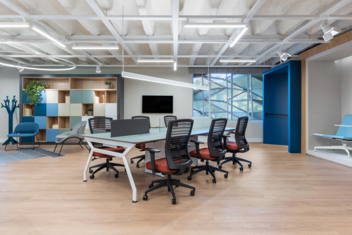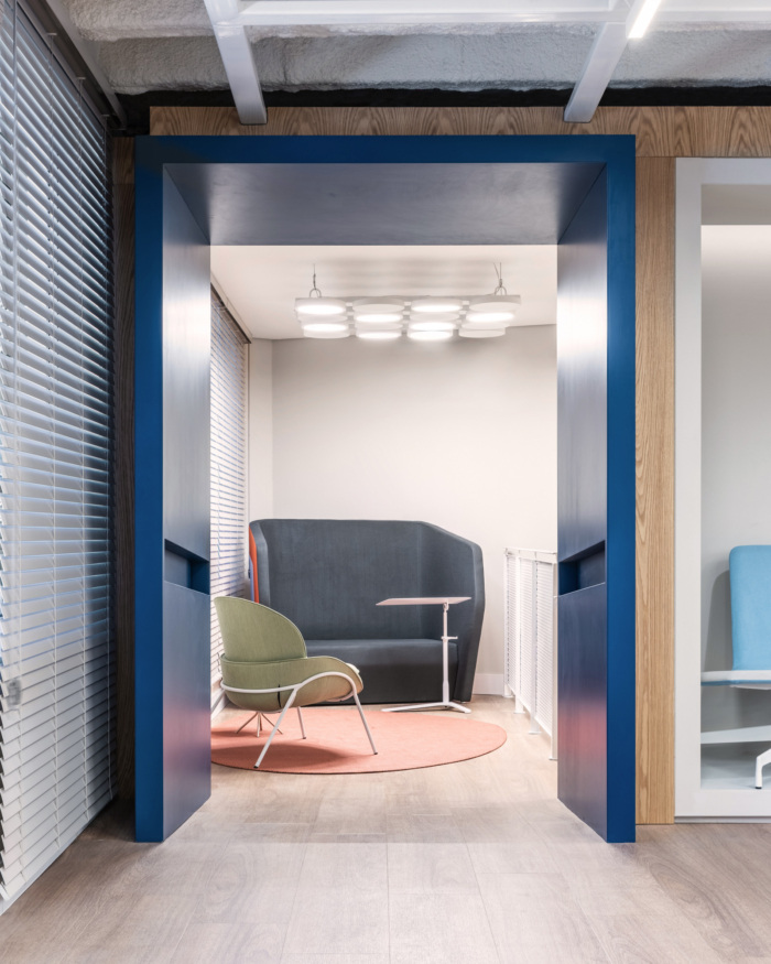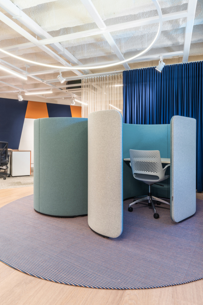 感官体验受到特别关注。入口以蓝色门廊为标志,将整个楼层框起来,突出了一个新的文化空间。为了营造一个平等的交流和集体建设的环境,设计师采用了开放和综合的布局,一些移动面板和窗帘的设计目的是在必要时为员工提供一些隐私。#办公室装修设计案例#